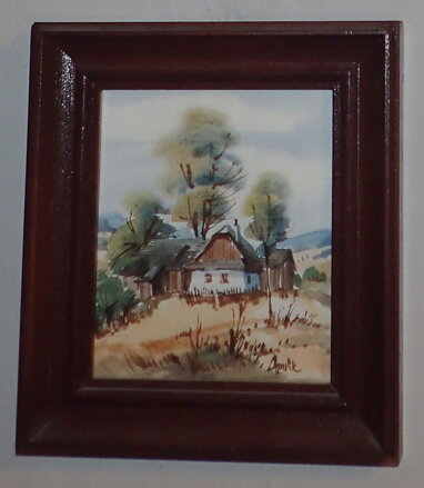 Rozměry včetně rámu cca 19,5 cm x 17,5 cm, rám je zdobený, místy má otluky. Akvarel na papíře či kartonu. Obraz je zasklený. Celkový stav - viz foto.