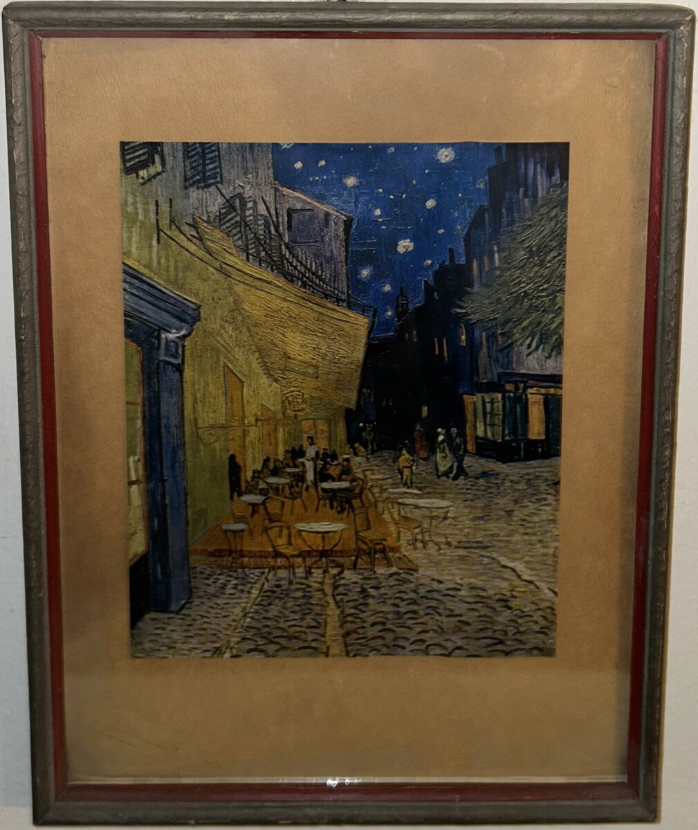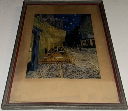 Obraz - Terasa kavárna v noci (reprodukce). Jedná se o novější reprodukci známého obrazu od malíře Vincenta Van Gogha, kterou namaloval v roce 1888. Převládající barvy tohoto obrazu jsou do žluta a jeho formát je na výšku. Rozměr originálu je 81 x 65,5 cm. Umístěním originálu obrazu je Rijksmuseum Kroller-Muller, Otterlo, Netherlands.