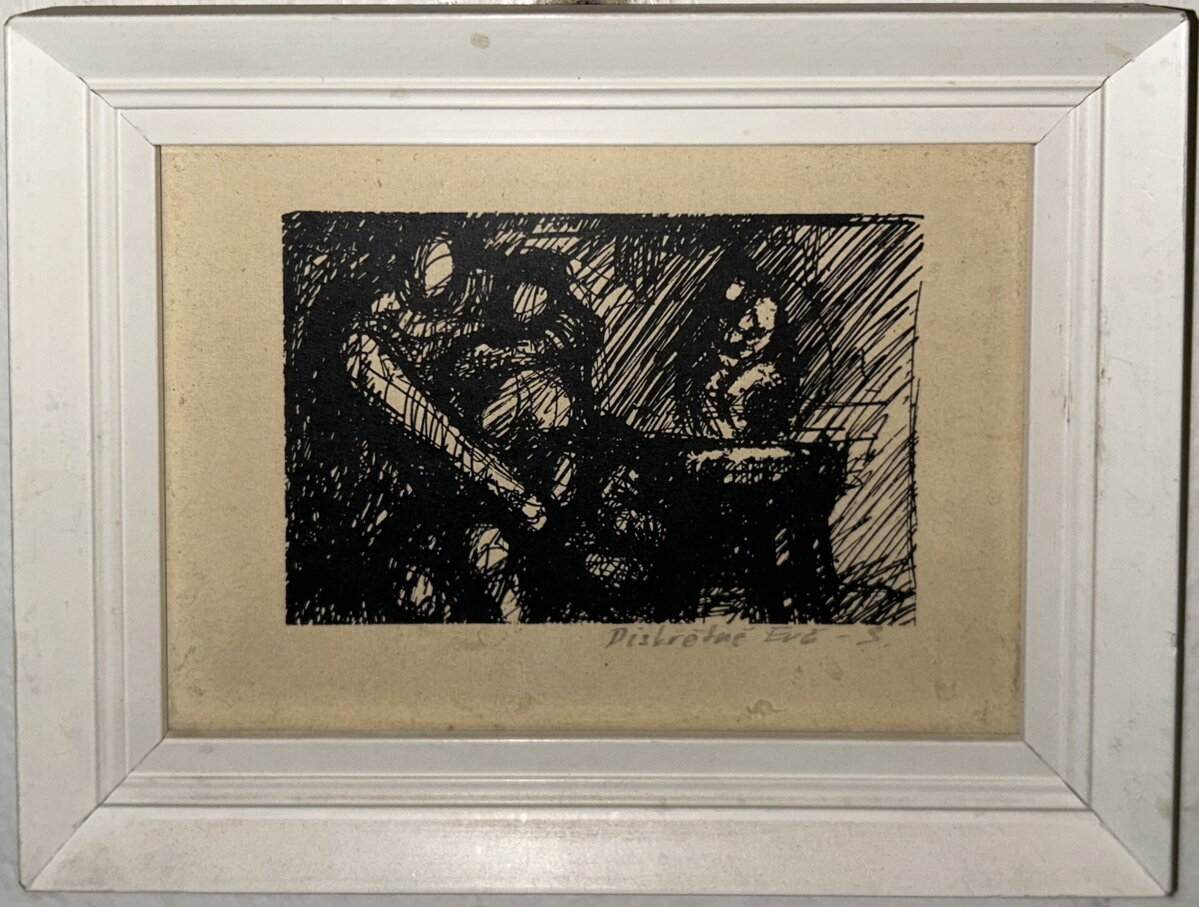 Rozměry včetně rámu cca 18 cm x 14 cm. Rám má místy otluky. Grafika na papíře. Obraz je zasklený. Celkový stav - viz foto.
