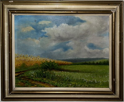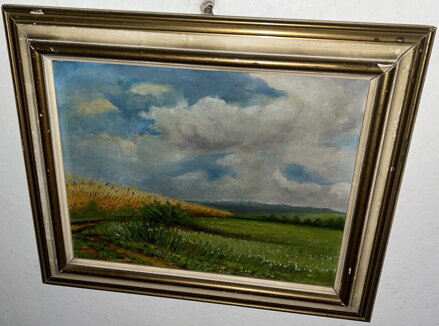 Rozměry včetně rámu cca 50 cm x 41 cm. Rám má místy otluky. Olej na kartonu. Celkový stav - viz foto.