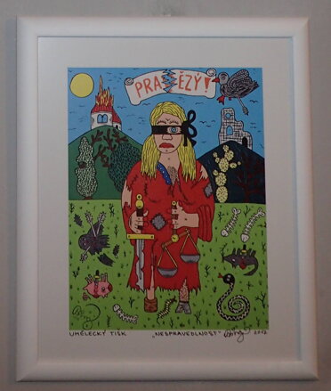 Obraz - Nespravedlnost. Autorem je známý malíř, grafik, hudebník, divadelník, spisovatel a textař František Ringo Čech. Signován a datován vpravo dole - viz foto. Umělecký tisk vlevo dole - viz foto. Název díla uprostřed dole - viz foto. Osobitý naivistický styl, pestrá paleta barev, specifický druh humoru.