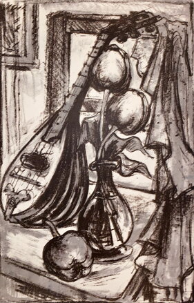 Grafika - Zátiší s loutnou a květinou ve váze. Signován a datován vpravo dole, číslován (7/15) a technika vlevo dole - viz foto. Autorem je malíř a grafik Oldřich Karel.