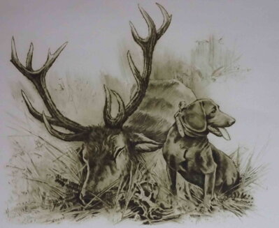 Obraz - Jezevčík u skoleného jelena. Signován vpravo dole - viz foto. Autorem je malíř a grafik Aleša Vaic - syn známého grafika Josefa Vaice. Obrazů s loveckými motivy není na trhu mnoho.