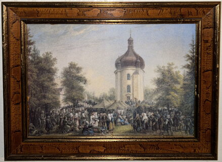 Obraz - Slavnosti u kostela Lomec. Jedná se o reprodukci.