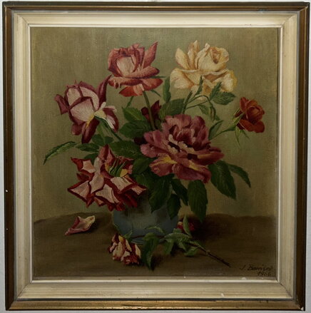 Obraz - Rozkvetlé růže ve váze. Signován a datován vpravo dole - viz foto. Autorem je malíř Barášek.