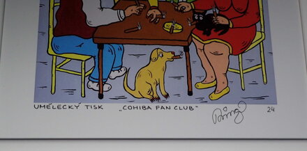 Obraz - Cohiba fan club. Autorem je známý malíř, grafik, hudebník, divadelník, spisovatel a textař František Ringo Čech. Signován a datován vpravo dole - viz foto. Umělecký tisk vlevo dole - viz foto. Název díla uprostřed dole - viz foto. Osobitý naivistický styl, pestrá paleta barev, specifický druh humoru.