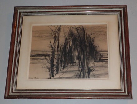 Rozměry včetně rámu cca 58 cm x 48 cm, rám je zdobený, místy má otluky. Uhel na papíře. Obraz je zasklený. Celkový stav - viz foto.