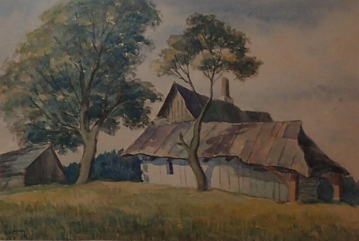 Obraz - Stromy u roubenky. Autorem je malíř Miloslav Lesný. Signován vlevo dole - viz foto.