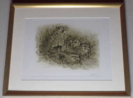 Obraz - Koroptev s mláďaty. Signován vpravo dole - viz foto. Autorem je malíř a grafik Aleša Vaic - syn známého grafika Josefa Vaice. Obrazů s loveckými motivy není na trhu mnoho.