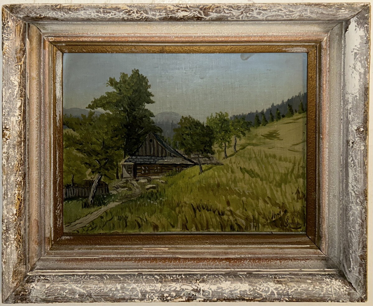 Obraz - Roubenka v kopci. Signován vpravo dole - viz foto. Autorem je malíř Šanda.