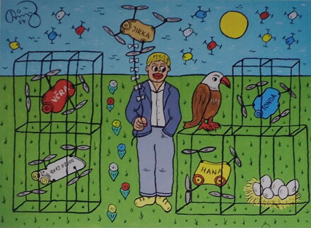 Obraz - Drony - chovná stanice. Autorem je známý malíř, grafik, hudebník, divadelník, spisovatel a textař František Ringo Čech. Signován a datován vpravo dole - viz foto. Umělecký tisk vlevo dole - viz foto. Název díla uprostřed dole - viz foto. Osobitý naivistický styl, pestrá paleta barev, specifický druh humoru.