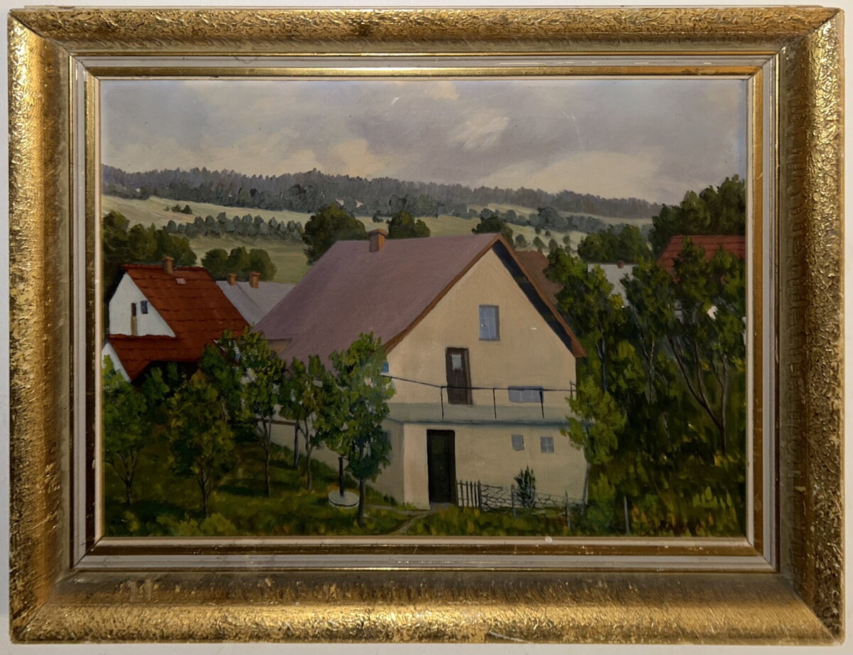 Obraz - Domy pod kopcem. Signován vpravo dole - viz foto. Autorem je malíř Beneš.