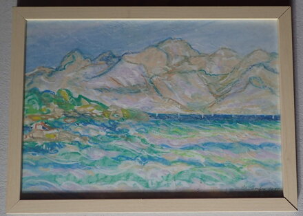 Obraz - Korfu - Ostrov v náladě. Signován a datován vpravo dole - viz foto. Autorkou je akademická malířka a grafička Olga Vargová Doležalová. Zezadu obrazu je autorský štítek, kde je uvedena autorka, technika, rozměr, název obrazu atd. - vše viz foto.