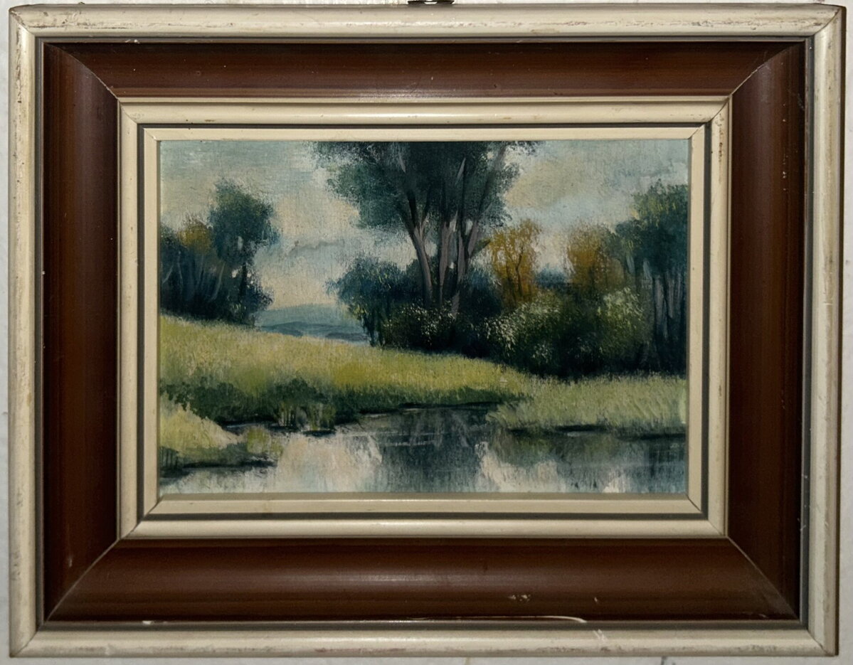 Obraz - Jezero v krajině. Autorem je zřejmě malíř a grafik Ludvík Vichr. Člen PALETA KLUB nezávislých výtvarníků v Karlových Varech.
