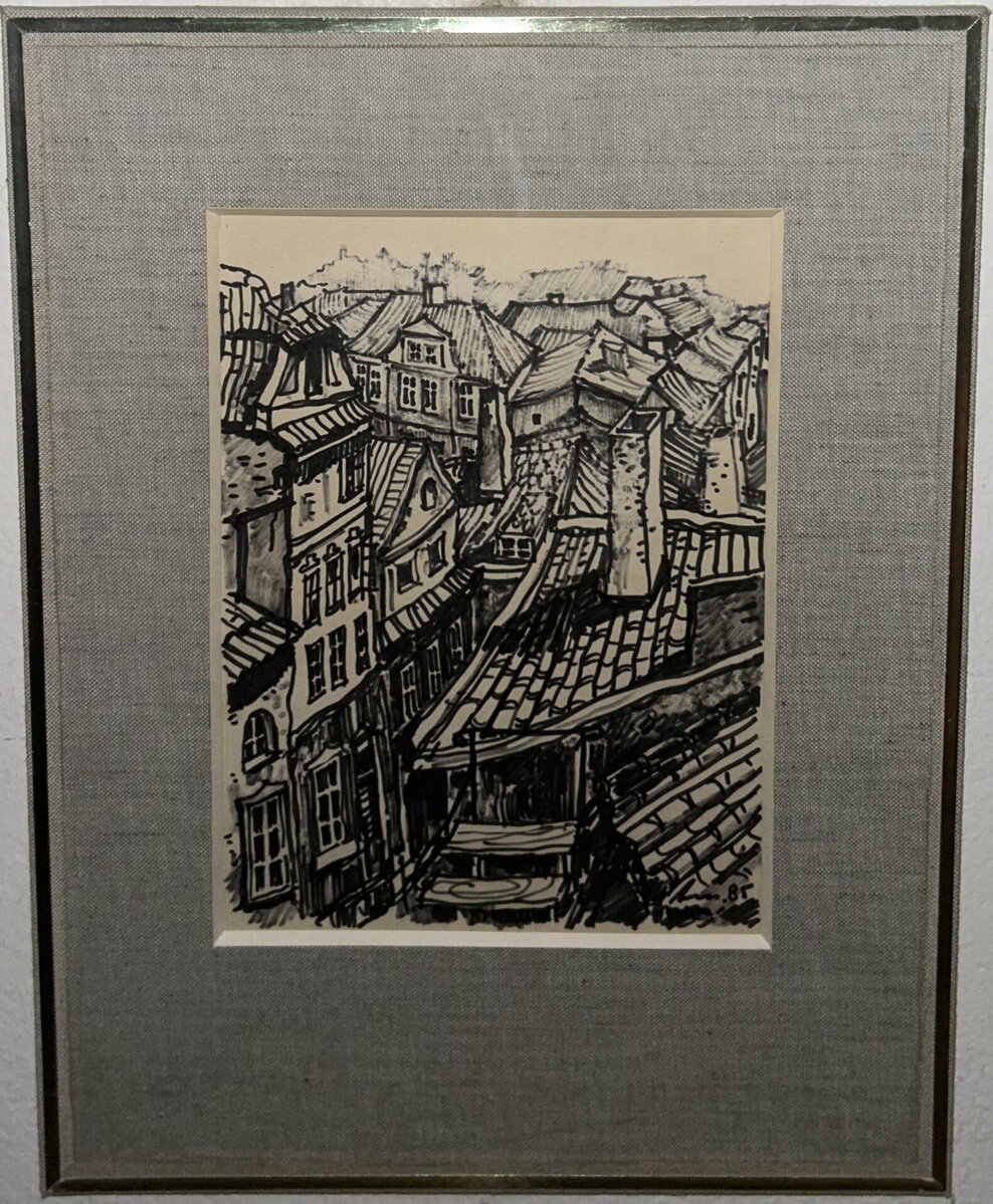 Obraz - Střechy. Signován a datován vpravo dole - viz foto. Autorem je malíř Vlastimil Matyáš.