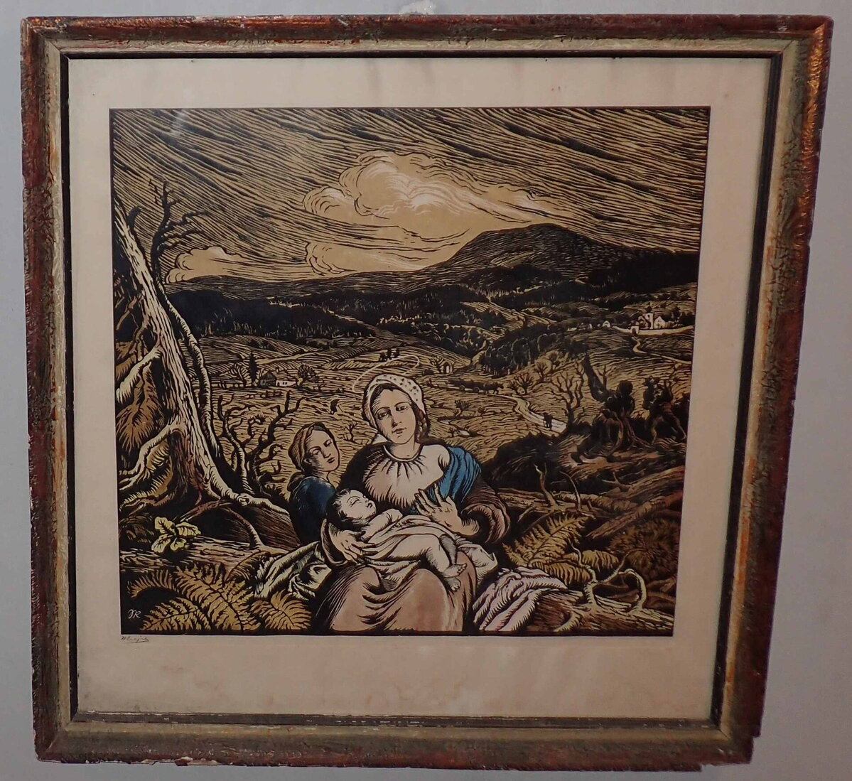 Rozměry včetně rámu cca 74 cm x 71 cm. Rám je zdobený, místy má otluky - viz foto. Barevný dřevoryt na papíře. Obraz je zasklený. Celkový stav - viz foto.