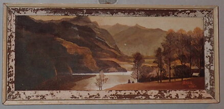 Rozměry včetně rámu cca 38 cm x 17 cm, rám je dřevěný, nátěr na rámu z velké části chybí, místy má otluky. Olej na desce. Celkový stav - viz foto.