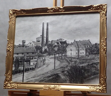 Rozměry včetně rámu cca 56 cm x 46 cm. Rám je krásně zdobený, místy má otluky - viz foto. Uhel na papíře či kartonu. Obraz je zasklený. Celkový stav - viz foto.