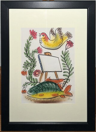 Obraz - Okoun, strnad a prázdné plátno. Signován a datován vpravo dole - viz foto. Autorem je malíř Otakar Štembera.