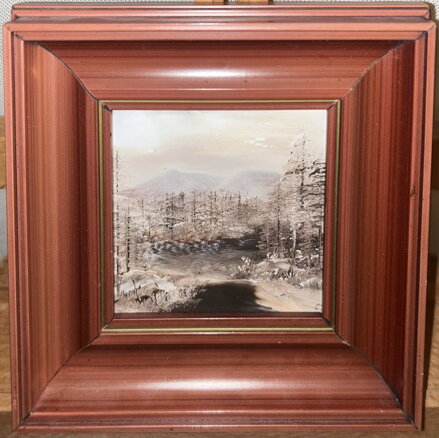 Celkové rozměry včetně rámu cca 17 cm x 17 cm. Rámeček má místy otluky. Olej na kachli. Celkový stav - viz foto.