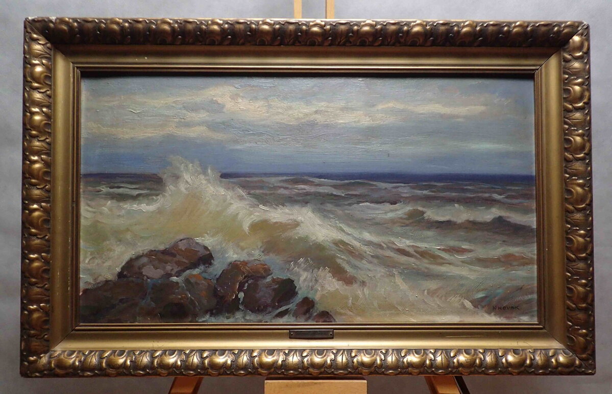 Obraz - Mořský příboj. Signován vpravo dole - viz foto. Autorem je akademický malíř Karel Novák. Uprostřed zepředu kovový štítek se jménem autora.