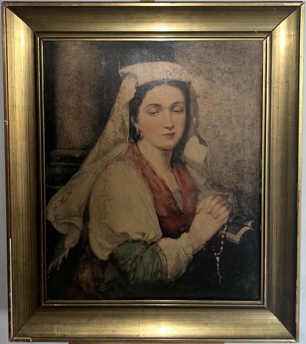 Celkové rozměry včetně rámu cca 70 cm x 61 cm. Rám je mohutný, místy má otluky - viz foto. Reprodukce na kartonu. Celkový stav - viz foto.
