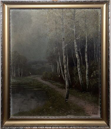 Obraz - Stezka podél tichého jezera. Signován vpravo dole - viz foto. Autorkou je malířka Štědrá.