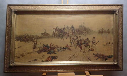 Obraz - Žižka před Kutnou Horou. Zmenšená dobová kopie Liebscherova nejvýznamnějšího obrazu "Žižka před Kutnou Horou", plastický tisk na plátně, místy drobná poškození - viz foto.