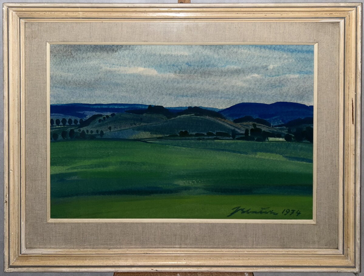 Celkové rozměry včetně rámu cca 83 cm x 63 cm. Rám má místy otluky. Akvarel na kartonu. Obraz je zasklený. Celkový stav - viz foto.