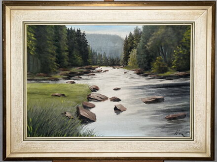 Obraz - Lesní řeka. Autorem je malíř František Líva. Signován vpravo dole - viz foto.