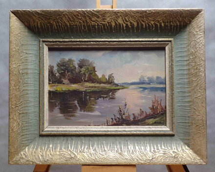 Rozměry včetně rámu cca 43 cm x 38 cm. Rám je mohutný, zdobený, místy má otluky - viz foto. Olej na desce. Celkový stav - viz foto.