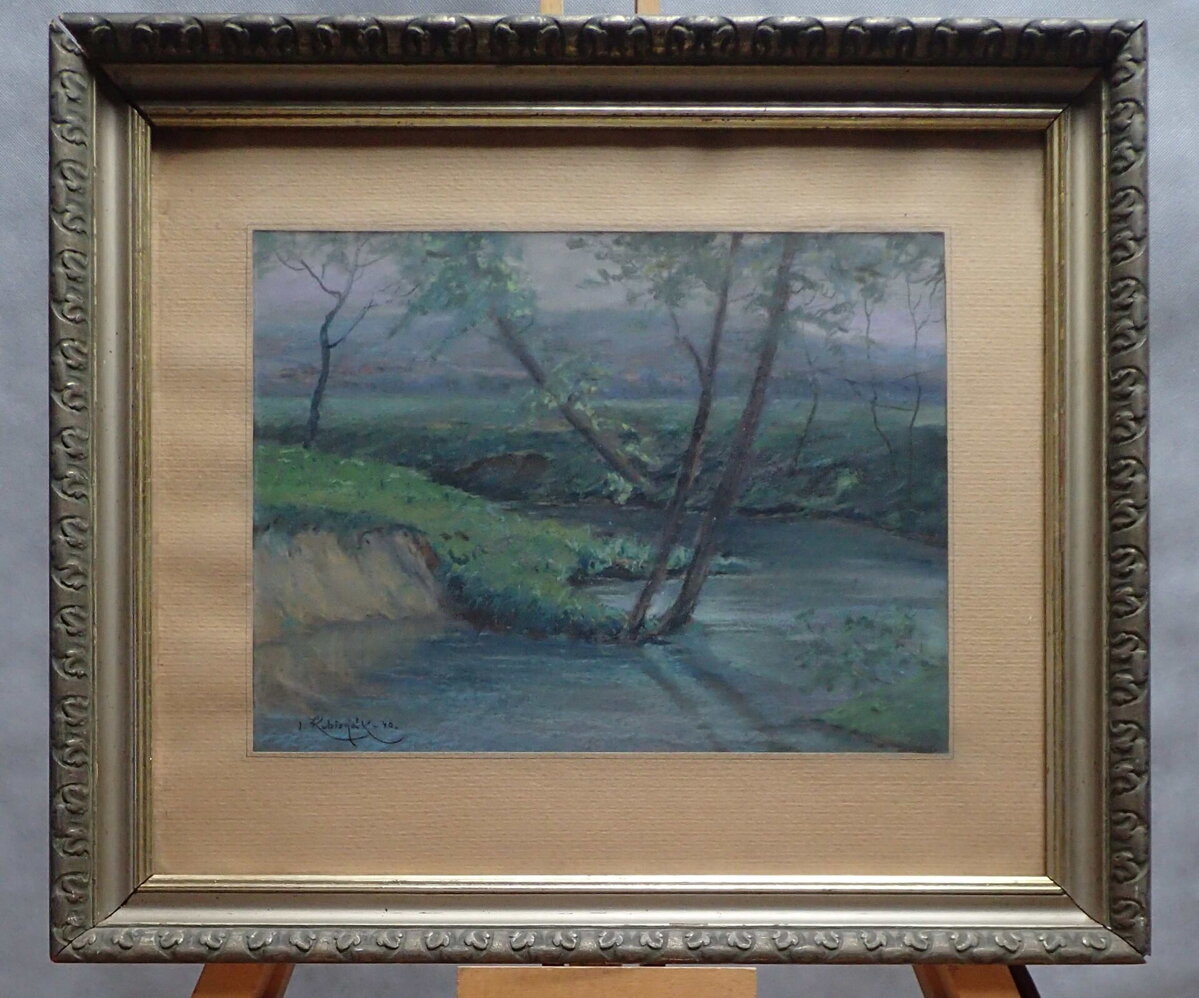 Rozměry včetně rámu cca 49 cm x 42 cm. Rám je mohutný, zdobený, místy má otluky. Křídový pastel na papíře. Obraz je zasklený. Celkový stav - viz foto.
