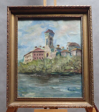 Obraz - Impresionistická krajina s věží. Autorem je malíř Malinovský. Signován vpravo dole - viz foto. Pokud by jste někdo poznal o jakou věž se jedná, budeme rádi, když nám to napíšete emailem.