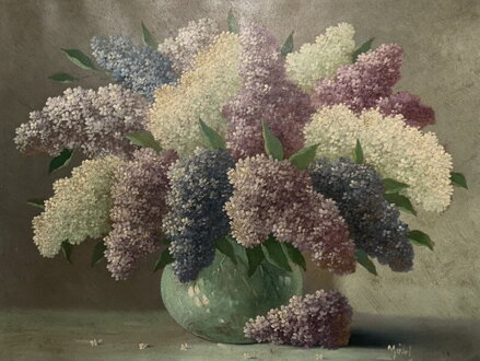 Obraz - Šeříky ve váze. Signován vpravo dole - viz foto. Autorem může být malíř Josef Mühl (1877-1938) či Antonín Mühl (1856-1905) - posuďte sami dle signatury, stylu malby, motivu atd.