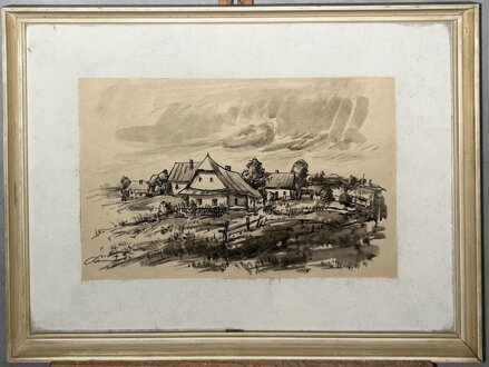 Celkové rozměry včetně rámu cca xxx cm x xxx cm. Rám má místy otluky. Kombinovaná technika na papíře. Obraz je zasklený. Celkový stav - viz foto.