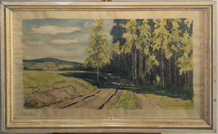 Celkové rozměry včetně rámu cca 64 cm x 39 cm. Rám má místy otluky. Akvarel na papíru. Obraz je zasklený. Celkový stav - viz foto.