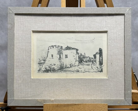 Obraz - Portál u hradu či zříceniny. Signován uprostřed dole dole - viz foto. Autorem je akademický malíř a národní umělec Karel Stehlík.