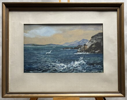 Obraz zachycující rozbouřené moře u skalnatého pobřeží, s racky letícími nad vlnami. Tento typ motivu, známý jako marina, byl populární u mnoha umělců, zejména v období romantismu, kteří se snažili zachytit dramatickou a mocnou povahu moře.