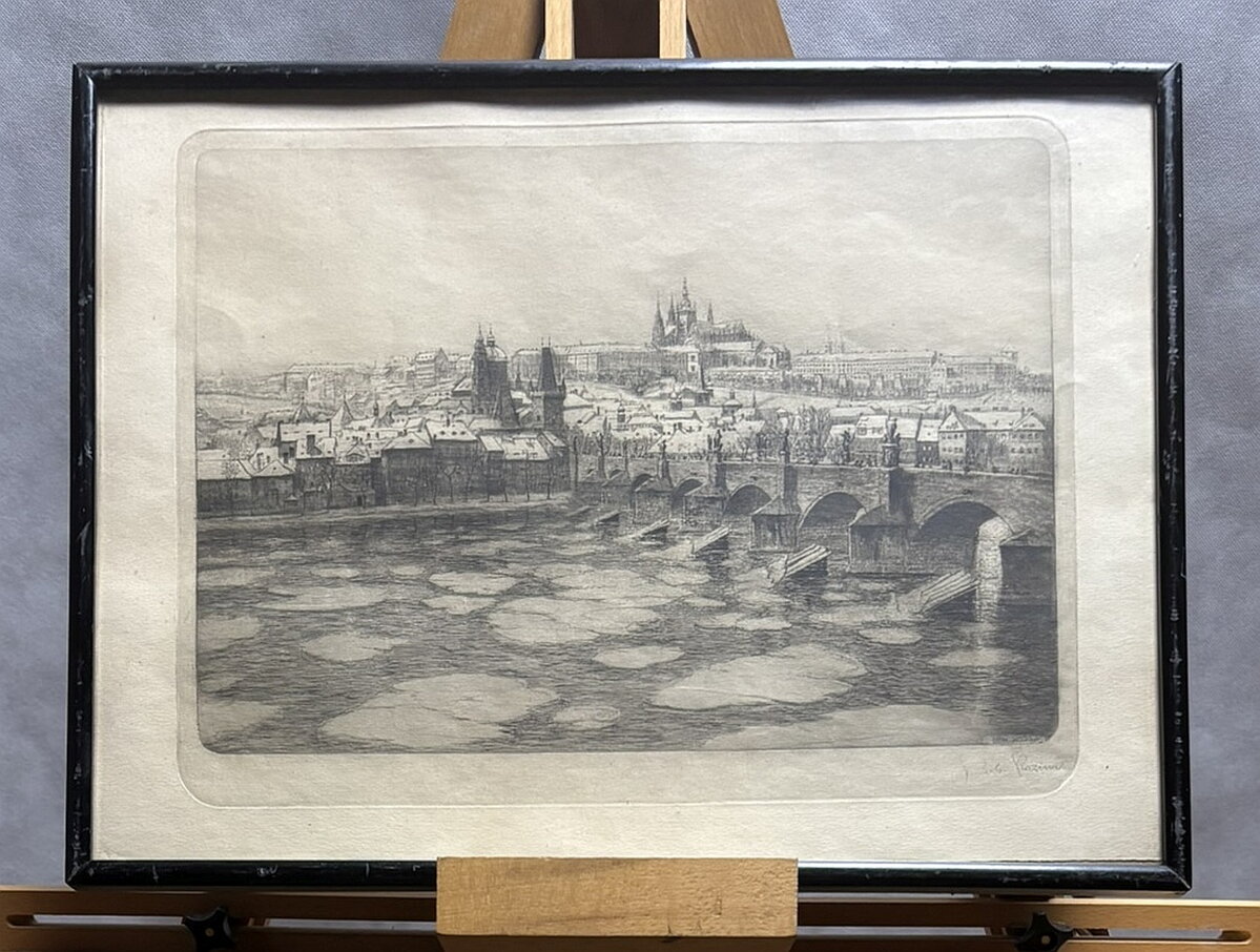 Rozměry včetně rámu cca 42 cm x 32 cm. Rám je úzký, místy má otluky - viz foto. Originální signovaný lept na papíře. Obraz je zasklený. Celkový stav - viz foto.