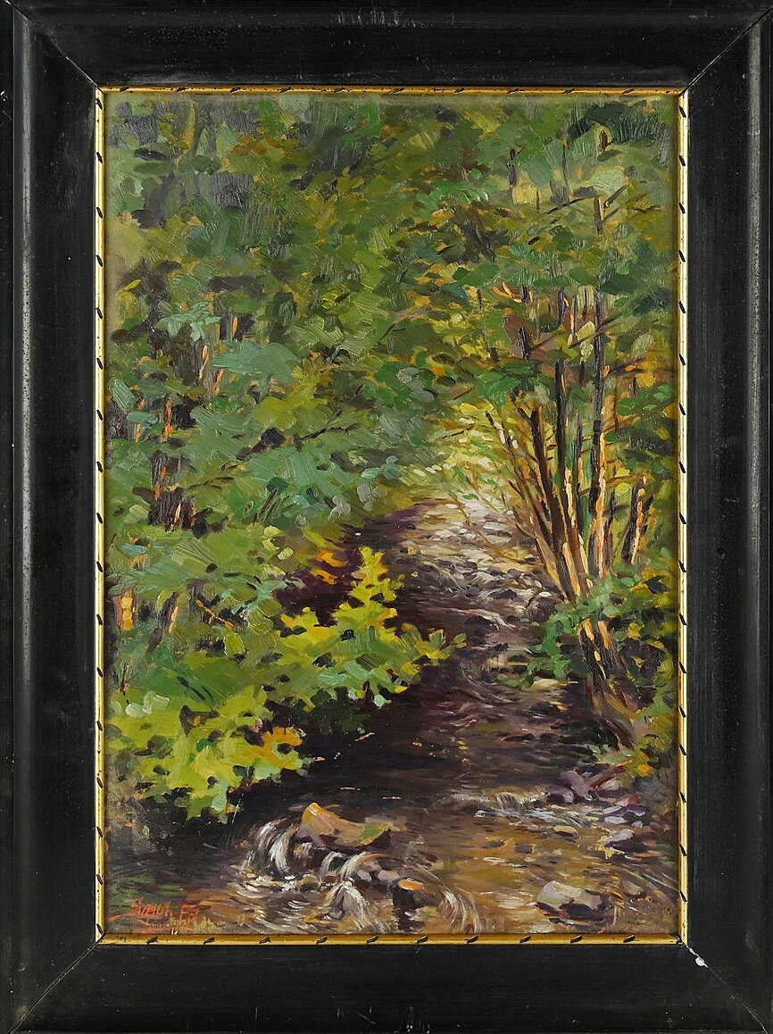 Obraz - Zarostlý potok. Signován vlevo dole - viz foto. Autorem je malíř Eduard Světlík. Impresionisticky laděný pohled na potok protékající hustým listnatým lesem, kde hraje hlavní roli hra světla a stínu v zeleni.