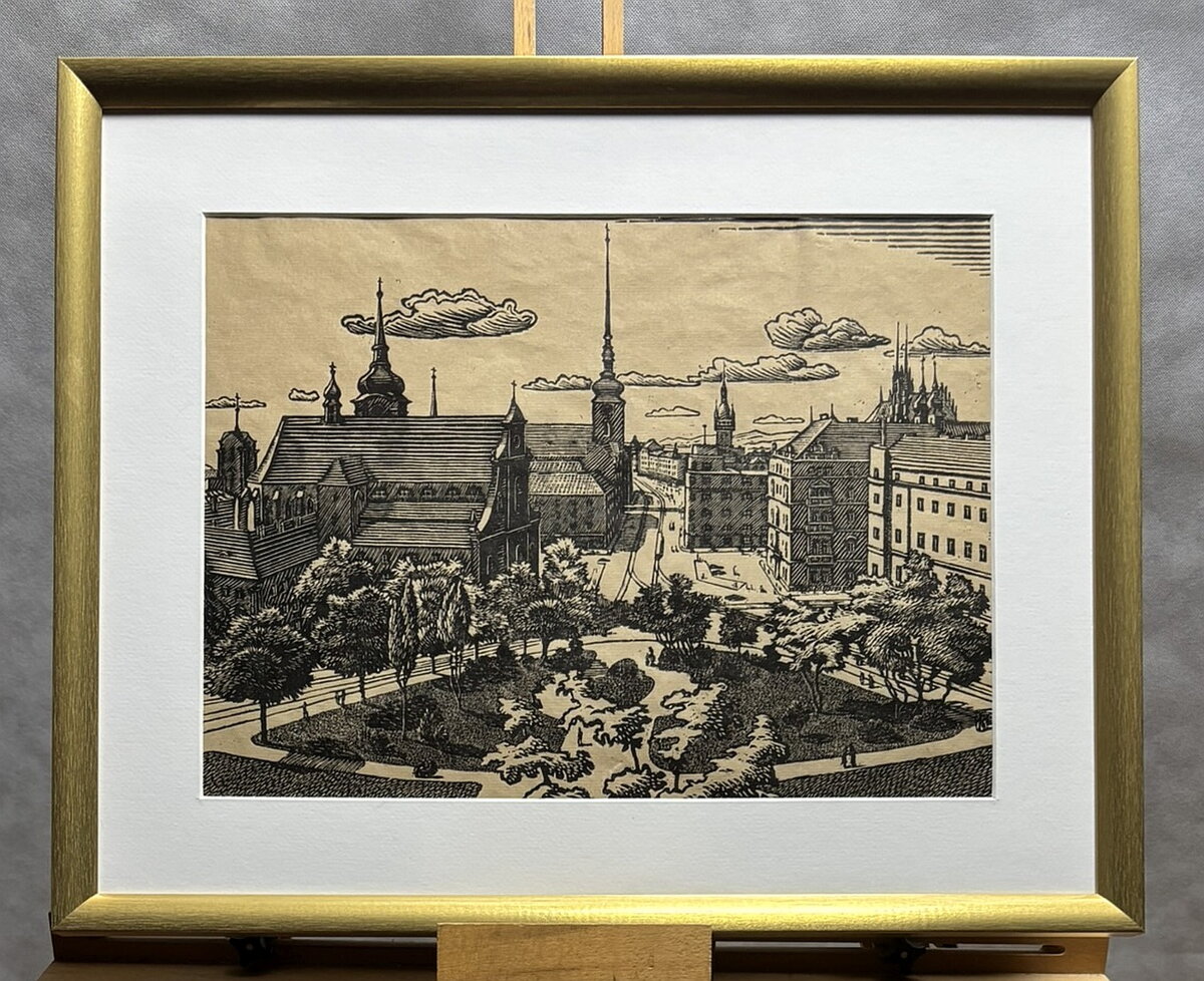 Rozměry včetně rámu cca 53 cm x 43 cm. Obraz je adjustován do nového rámu. Velkoformátový dřevoryt na papíře. V levém horním růžku kousíček papíru pod paspartou chybí - viz foto. Celkový stav - viz foto.