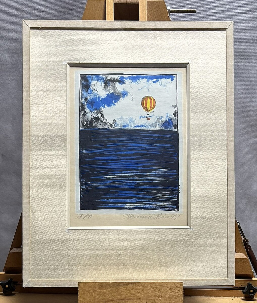 Originální barevná signovaná litografie - Balón. Autorem je malíř a grafik Tomáš Bím. Signovaná a datovaná vpravo dole - viz foto. Číslovaná 56/80 vlevo dole - viz foto.
