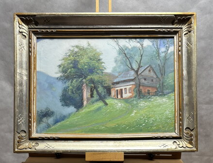 Rozměry včetně rámu cca 63 cm x 48 cm. Rám je původní, krásně zdobený, místy má otluky - viz foto. Olej na kartonu. Obraz je zasklený. Celkový stav - viz foto.