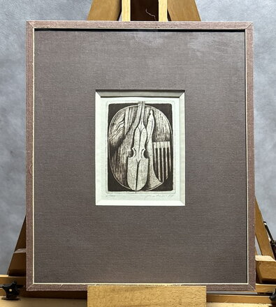 Obraz - Housle. Autorem je malíř a grafik Lubomír Netušil. Signován a datován vpravo dole - viz foto. Číslován 6/100 vlevo dole - viz foto.
