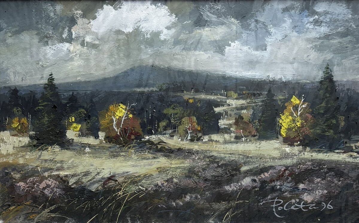 Obraz - Šumavská krajina. Autorem je akademický malíř Karel Polata. Signován a datován vpravo dole - viz foto. Expresionistický styl malby. Zezadu obrazu je samolepka autora - viz foto. Na další obrazy od tohoto autora se můžete podívat zde...
