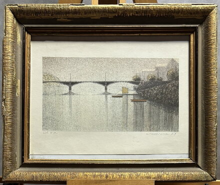 Barevná signovaná datovaná litografie - Řeka. Autorem je malíř a grafik Jiří Chadima. Signovaná a datovaná vpravo dole - viz foto. Zezadu grafiky je uveden název díla, autor, razítko čfvu atd. - viz foto.