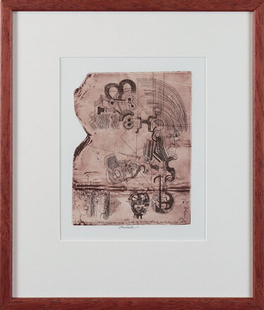Rozměry včetně rámu cca 32 cm x 27 cm, výřez pasparty 18,5 x 15 cm, samotný lept cca 15,8 x 12 cm. Rám je úzký, místy má otluky - viz foto. Lept na papíře. Obraz je zasklený. Celkový stav - viz foto.