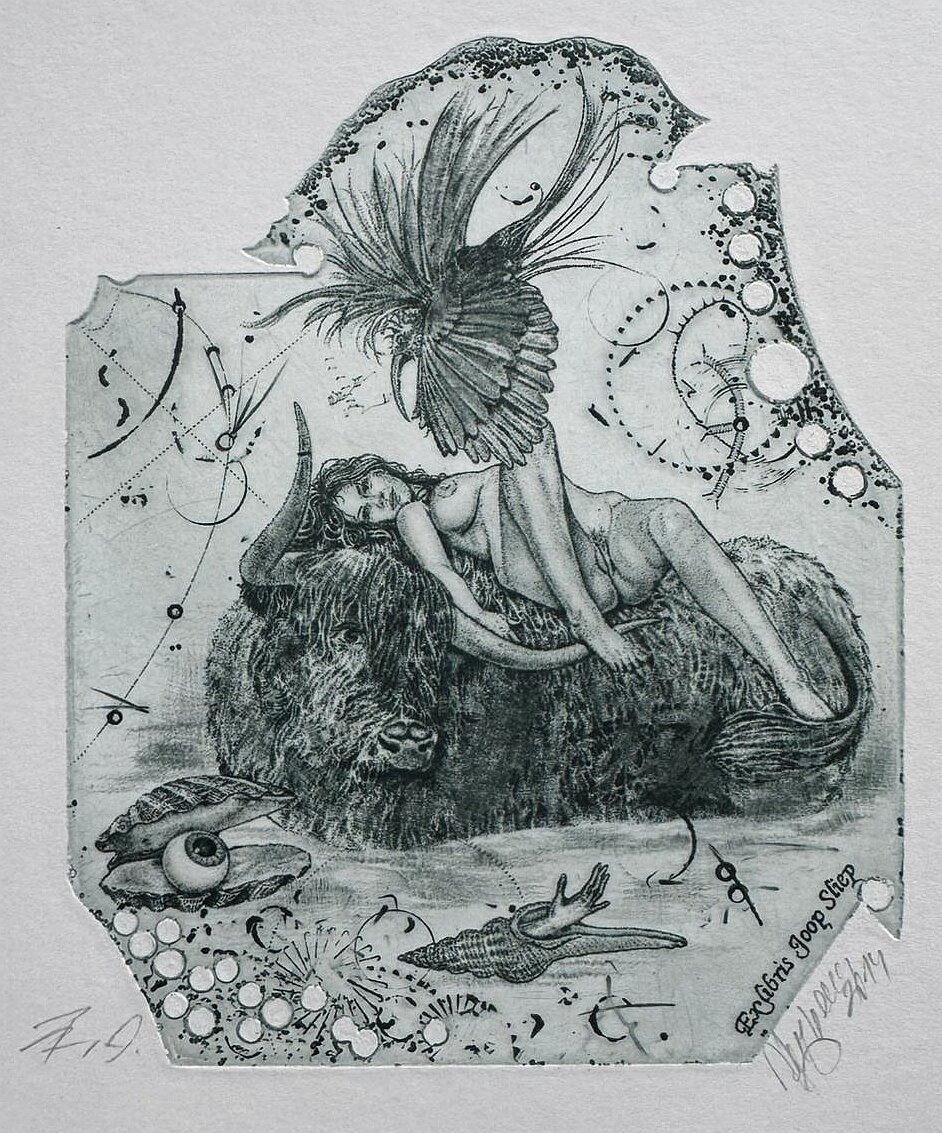 Celý obraz je sevřen do nepravidelného tvaru (typického pro autorovy lepty), což působí jako pohled do nitra snu. Mohutnost býka poskytuje pocit bezpečí, zatímco surrealistické detaily kolem připomínají, že se nacházíme v mýtickém bezčasí, kde se rodí historie našeho kontinentu.