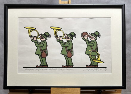 Obraz - Myslivci slavnostní fanfára. Autorem je malíř a grafik Jiří Winter Neprakta. Signován a datován vpravo dole - viz foto. Vlevo dole věnování "Slavnostní fanfára pro Gabrielu Žemličkovou" - viz foto.