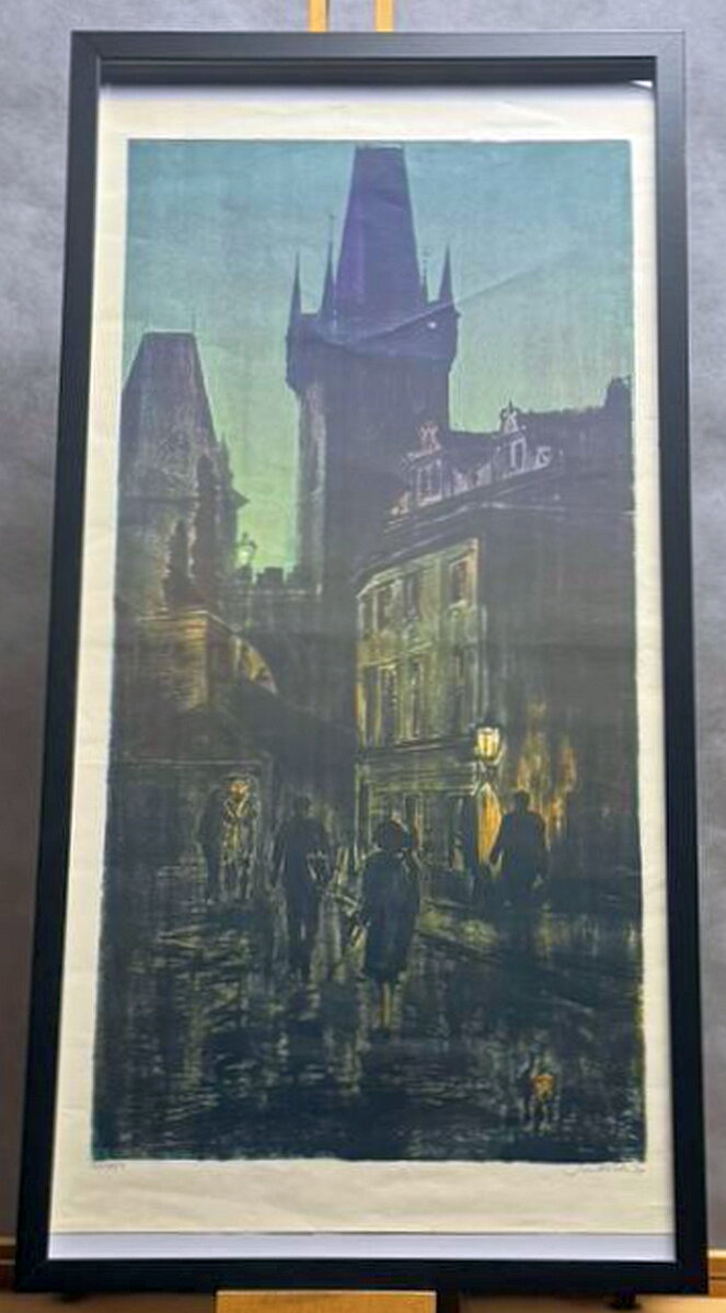 Obraz - Noční Praha Malostranská mostecká věž (Pragensia). Autorem je malíř a grafik Jan Mácha. Signován a datován vpravo dole - viz foto. Číslován 21/150 vlevo dole - viz foto. Provenience - z rodinné pozůstalosti JUDr. Ladislava Šalouna (1900-1968), syna sochaře Ladislava Šalouna.